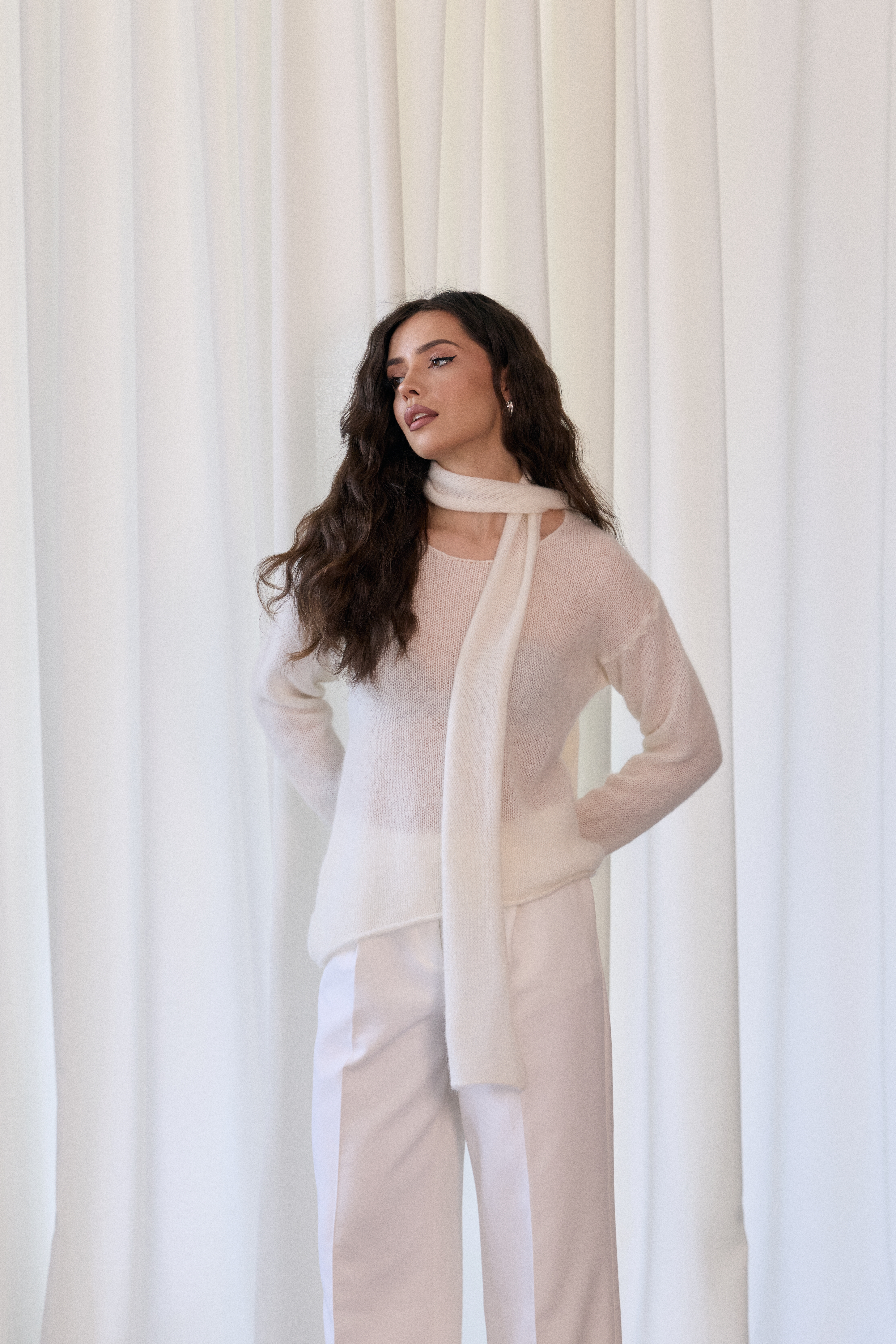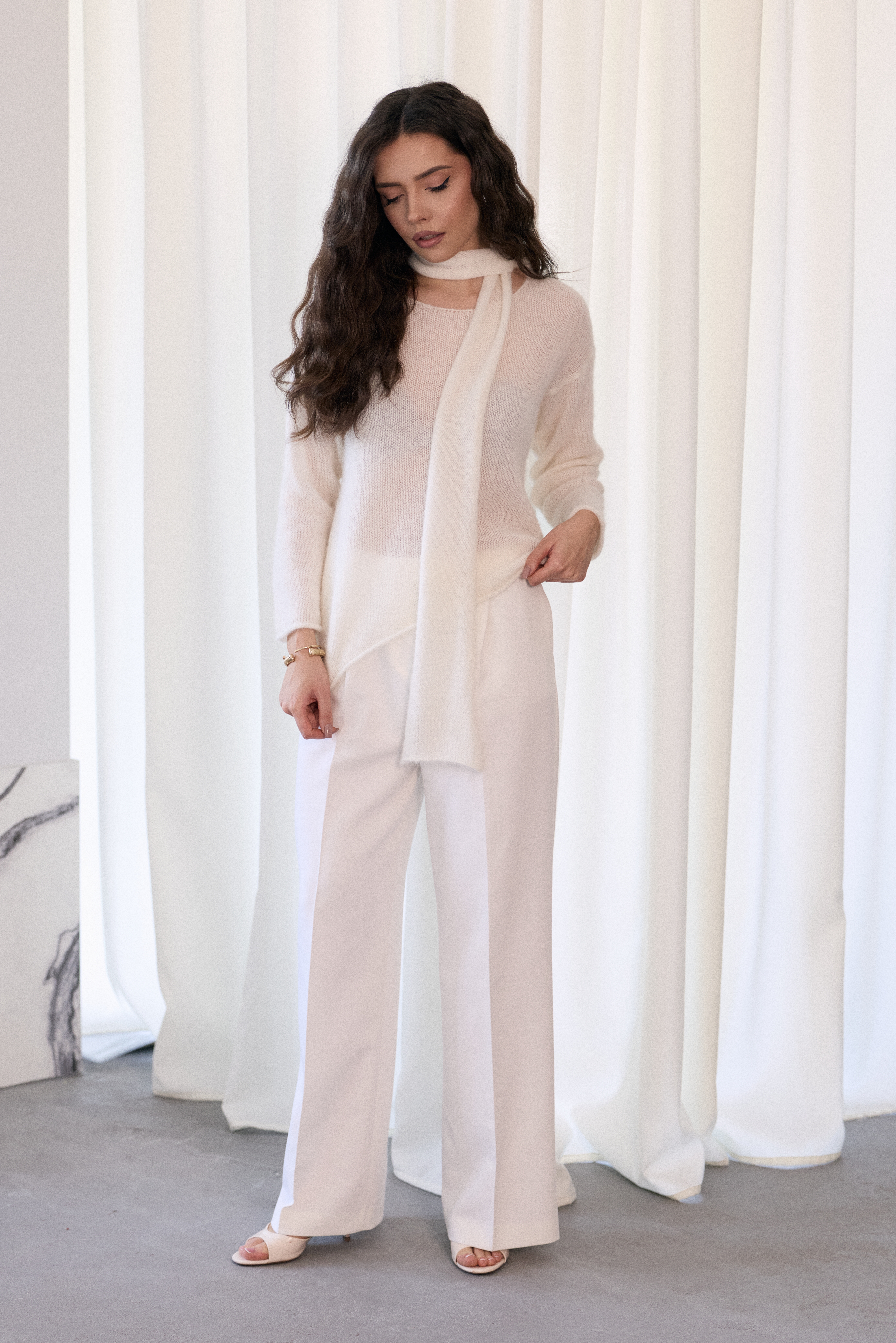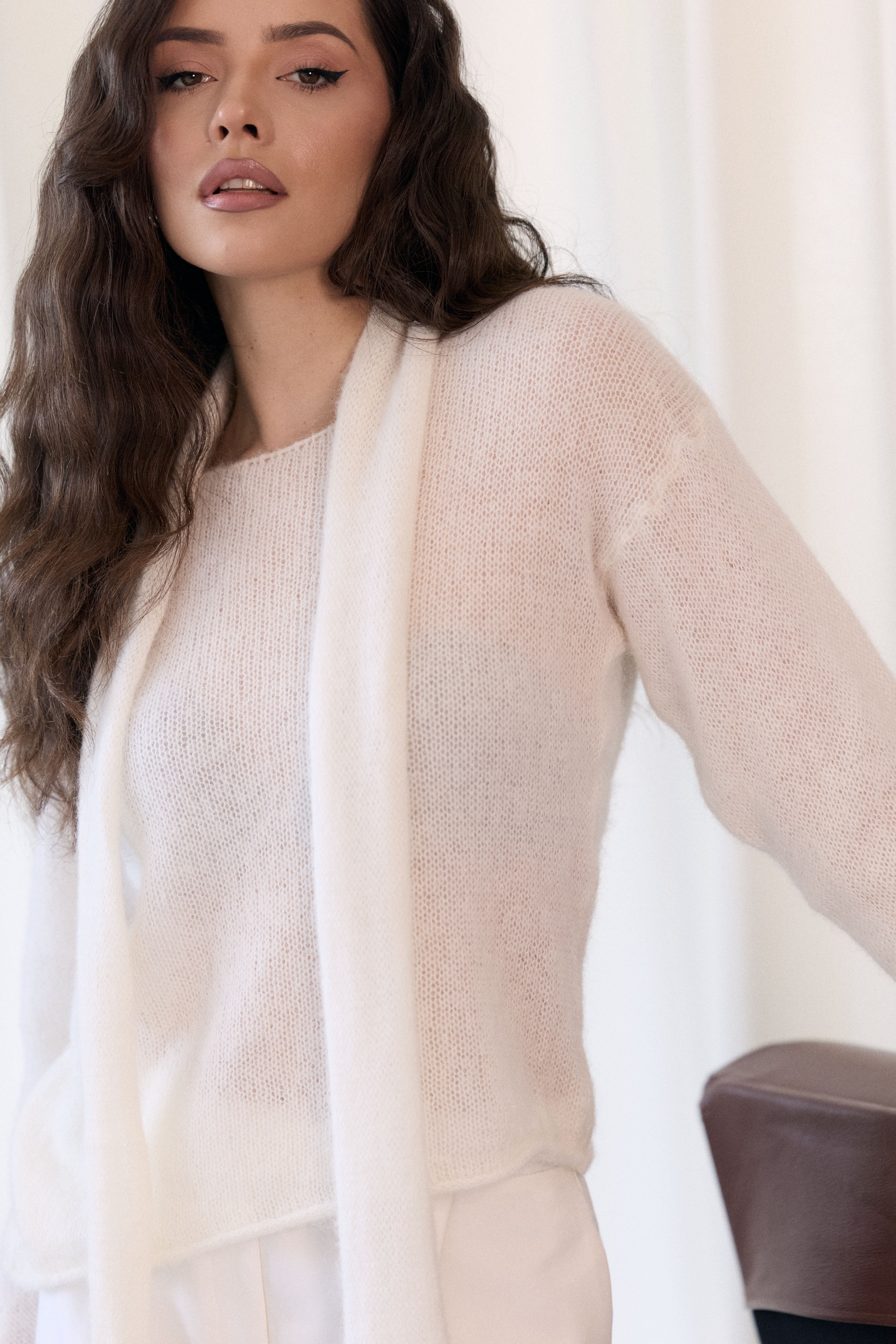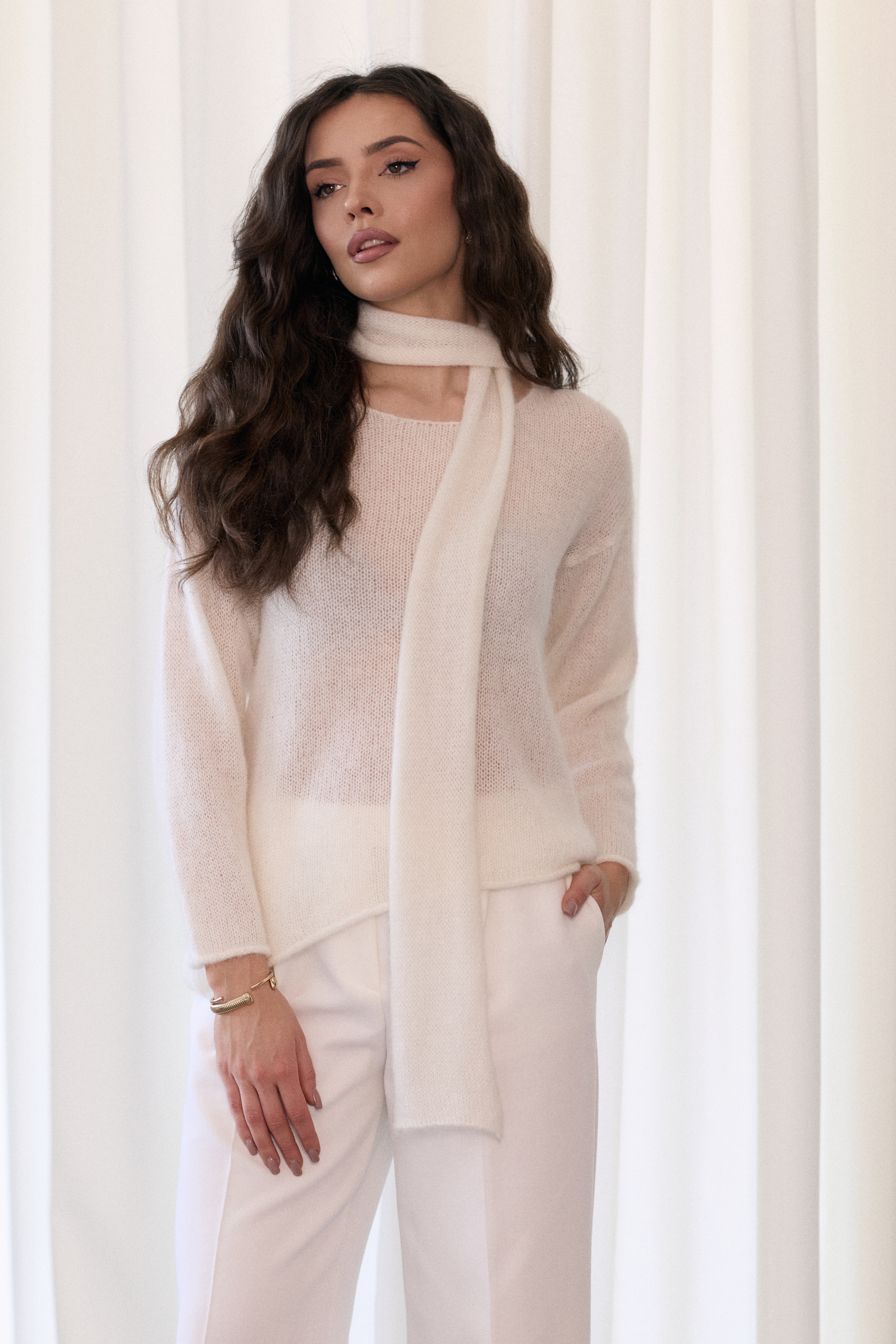 - Sweter o asymetrycznym fasonie z efektownym szalem mocowanym na karku