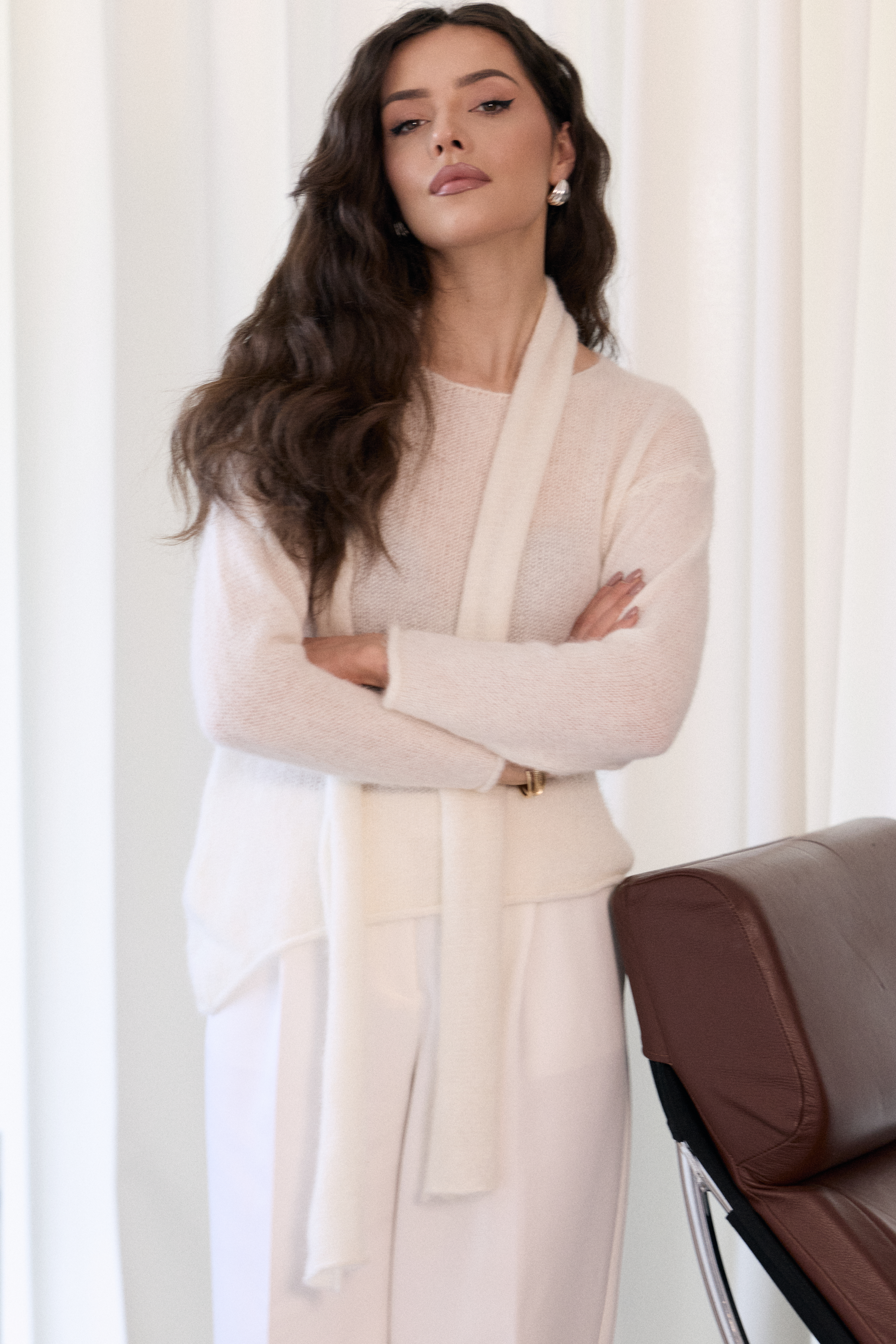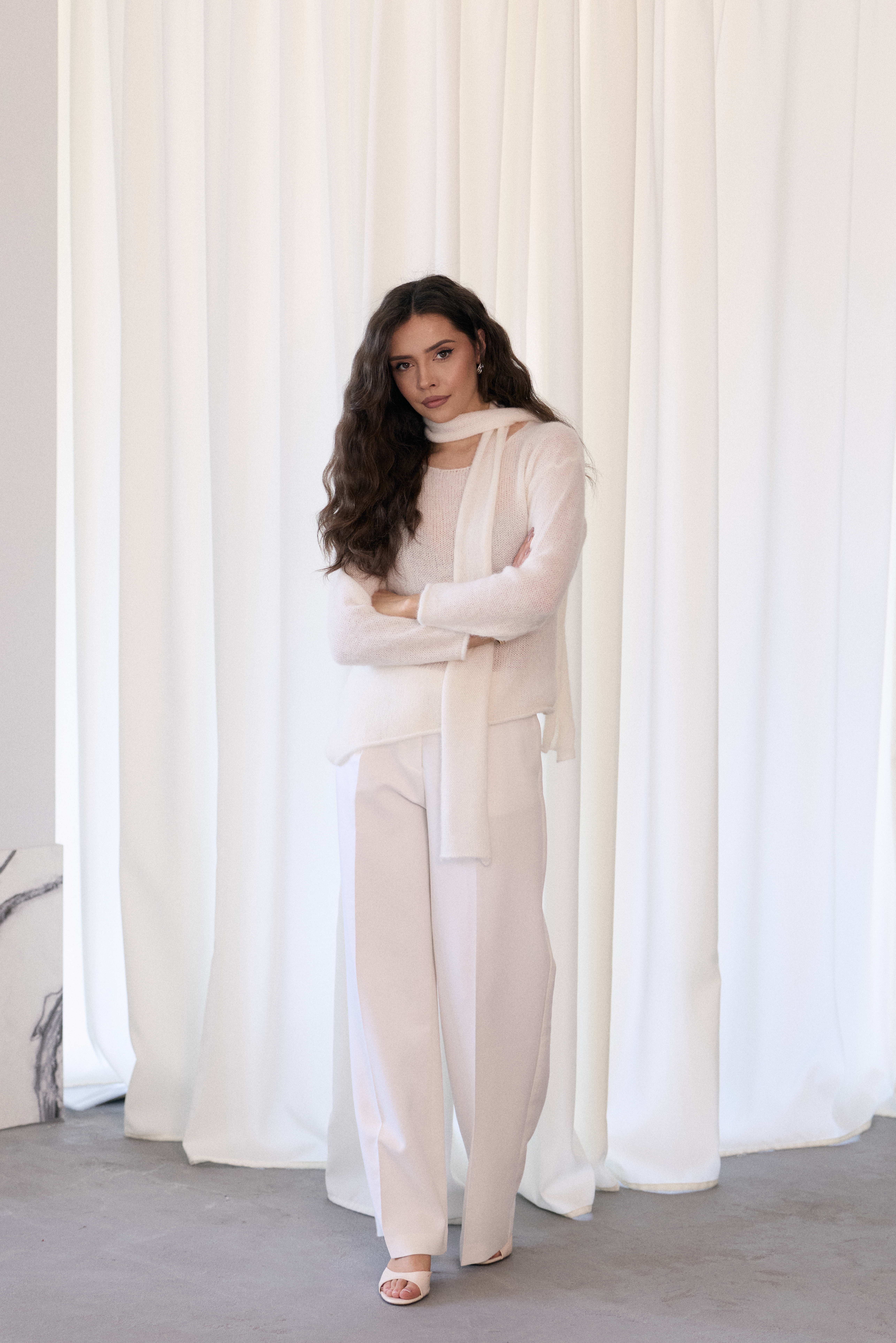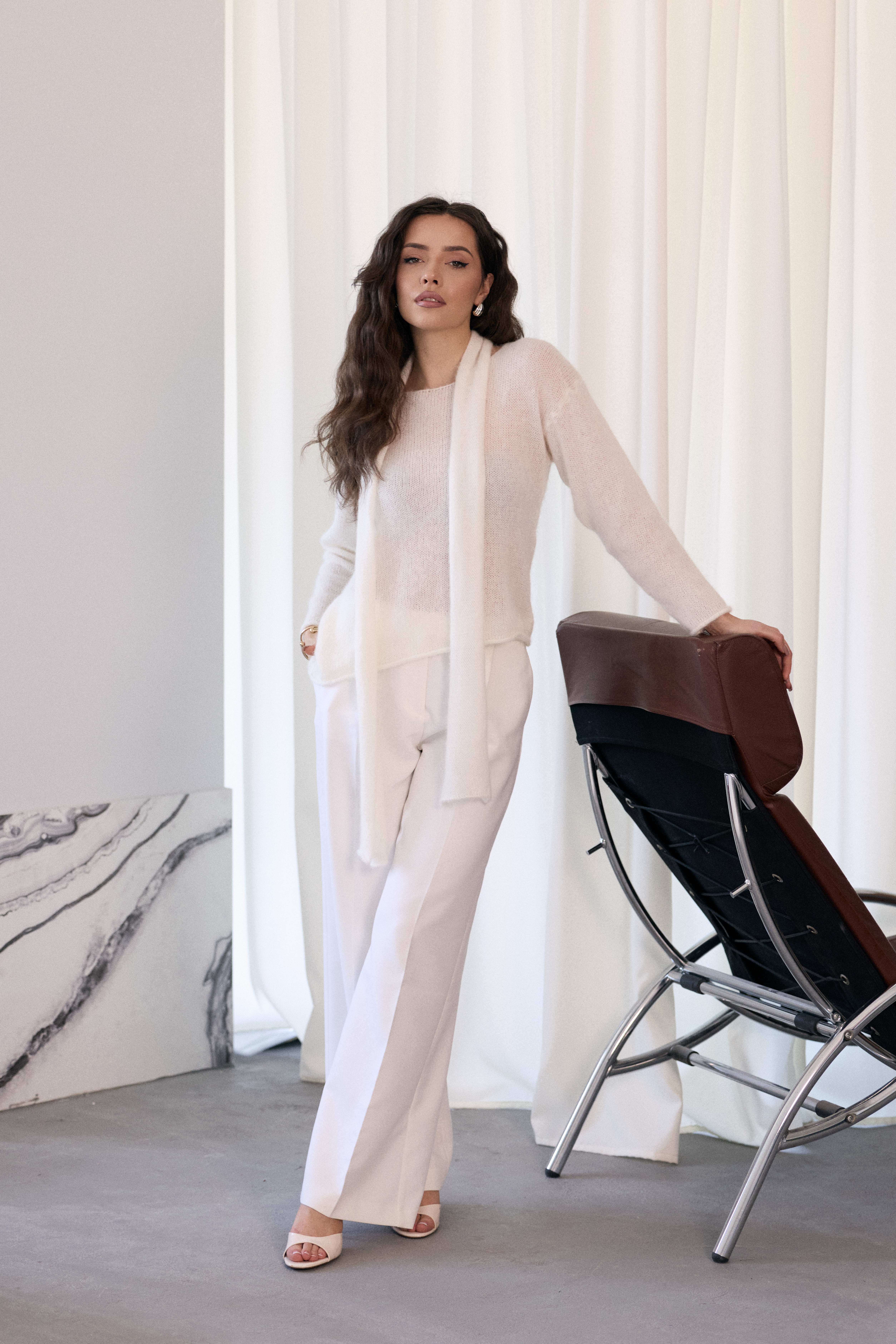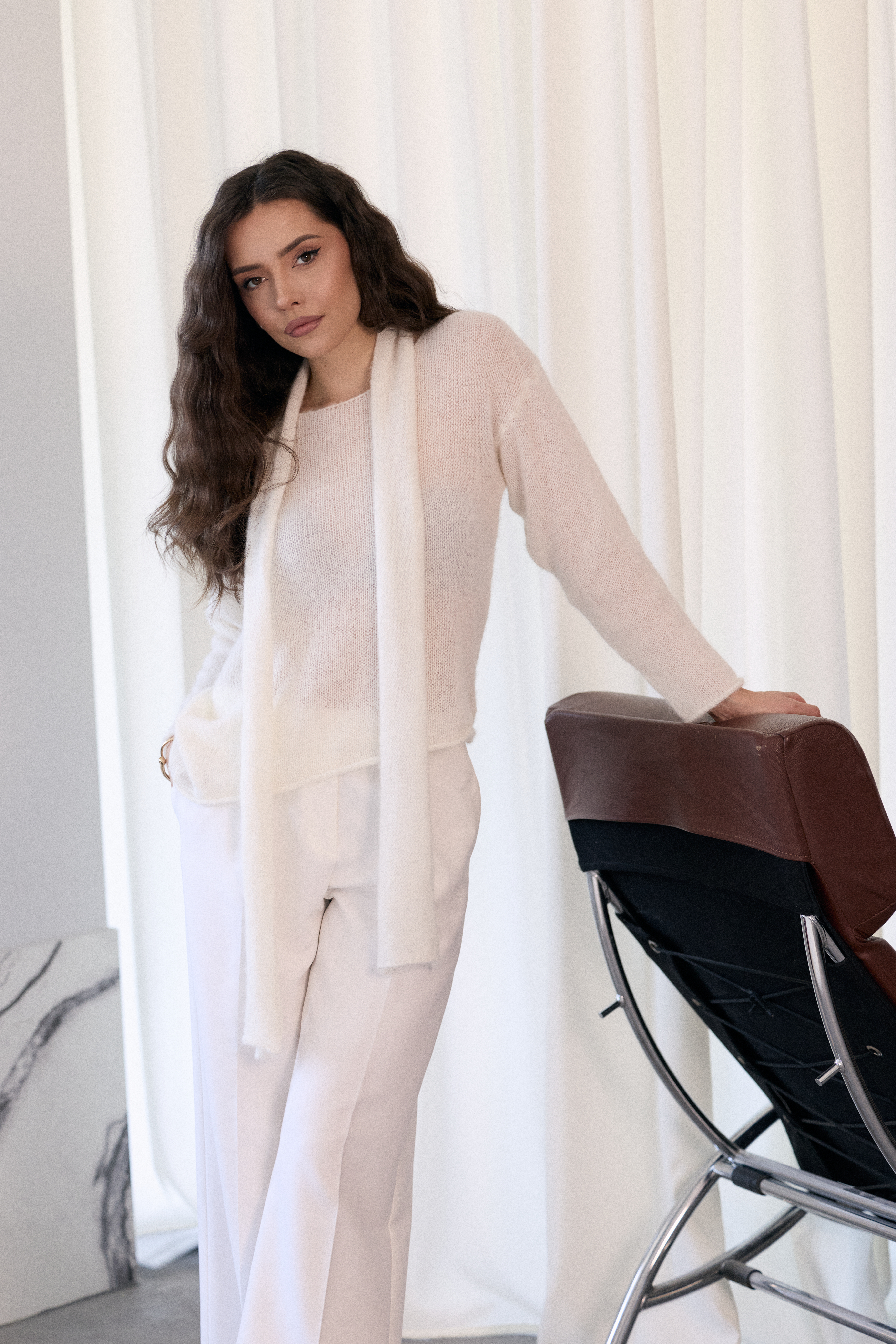 - Sweter o asymetrycznym fasonie z efektownym szalem mocowanym na karku