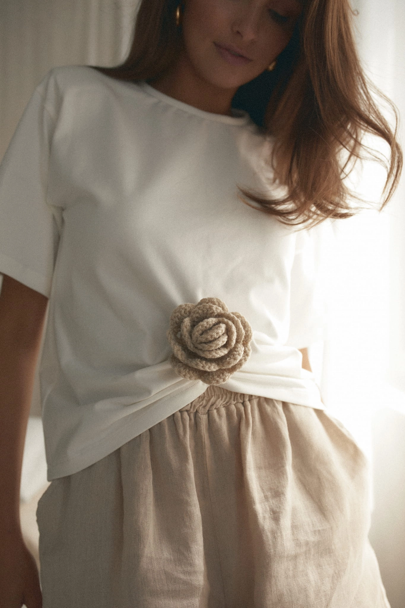 - Przód koszulki marszczony, zdobiony różą wykonaną na szydełku.